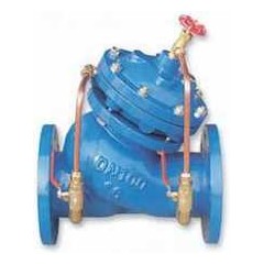 当水泵起动起后,水压作用于主阀阀盘下面和控制室下腔,此压力使主阀开启,控制室上腔的水经过调节阀B缓缓排到出口端,主阀缓缓开启.设定调节阀的开度可得到合适地主阀开启速度.当水泵停止工作后,进口端水压迅速下降,在自重、弹簧压力作用下快速关闭大部分开度,防止了水倒流余下的开度由控制室上腔的水压和下腔水压联合作用下缓缓关闭,关闭速度减慢形成了缓冲,防止压力剧增.