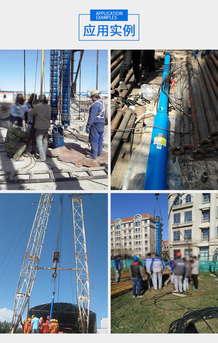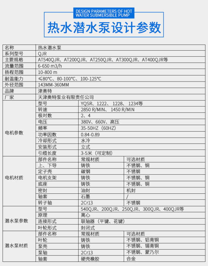 本公司研制的热水泵分为QJR系列和ESP系列,针对不同工况均有对应的泵型可供选择,其中QJR系列高扬程地热潜水泵电潜泵,适用于包括温泉井水提升、地下热水提升;ESP系列高扬程热水潜水泵适用于海上石油采集、路基石油采集、石油勘探等广泛用于采油工业,也可用于高温、腐蚀性液体的提送,扬程可以达到上数千米,配套功率电机从20kW到1150kW,具有安装使用方便、可靠耐用等特点。QJR热水潜水泵高扬程地热井温泉抽水泵耐腐高压泵欢迎来电咨询为您 挑选合适的泵型:
