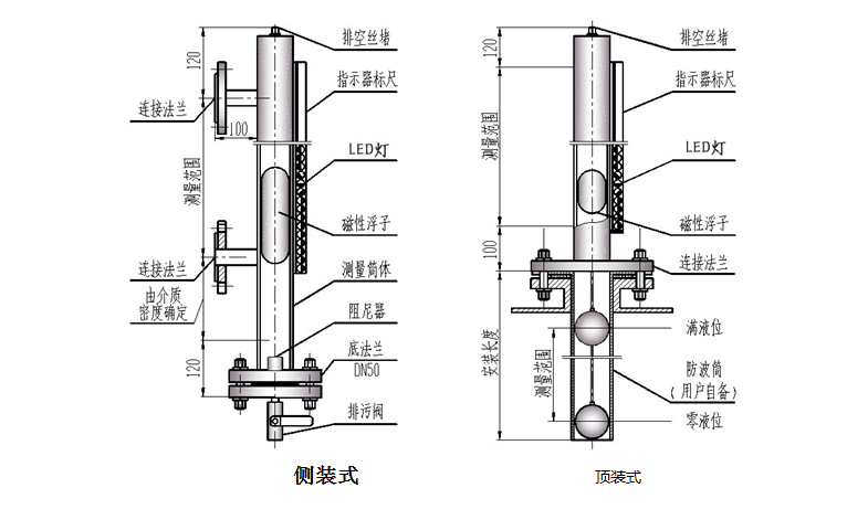 磁敏液位计有两种安装形式满足用户需求,包括:顶装式、侧装式。