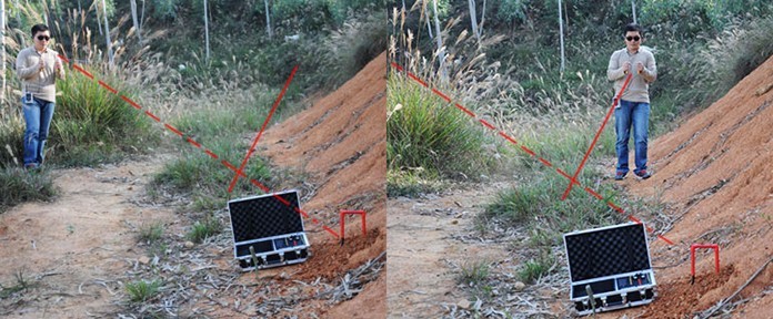 8. 重复 六步。当你接近发射天线和测试物这条线的时候,接收天线应该是交叉的。(记住:测试物和发射天线之间的信号线将会形成,而不是测试物和 发射器之间 的信号线)。当你走过这条线的时候,接收天线将不会交叉。在天线交叉处做下标记。现在,再远离发射器 些距离(如果 。开始距离发射器5到6米,则应到8 米处)。重复上述过程:在接收天线交叉处做下标记。然后通过发射器和做标记的两个地方画 条线,这就是你确定的X轴。关掉发射器和接受器,然后等15分 钟,把发射天线和发射器挪到 个新的地方,重复这 过程。记住要把发射天线埋进去。这次你确定了Y轴,X轴和Y轴的交叉处即目标物所在地。