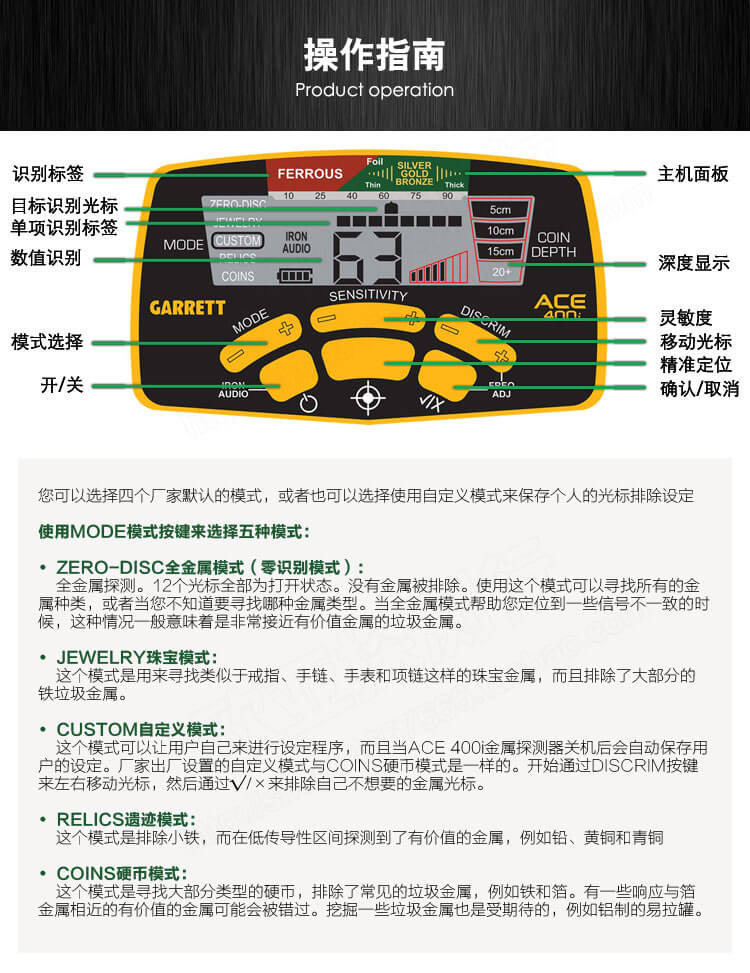 以超过45年广泛的研究和开发为后盾,盖瑞特ACE 400i金属探测器是目前很好的同类行业。无论你是经验丰富还是 个初学者,这款机器非常适合于各种检测您的环境中。 触式操作,在与触摸 个按钮的ACE400i权力,轻易地调整为地面矿物质和可立即开始搜索。