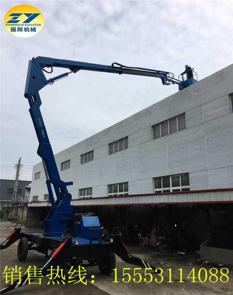 牵引曲臂式高空作业平台:移动方便,曲臂结构紧凑.采用新型优质型钢,强度高,重量轻,直接接入交流电或采用车自身动力启动,架设速度快,具有伸缩臂,工作台曲臂式高空作业升降车能悬伸作业、跨越 定的障碍或在 处升降可进行多点作业;http:/www.jnzhenyang.com平台载重量大,可供两人或多人同时作业并可搭载 定的设备;升降平台移动性好,转移场地方便;外型美观,适于室内外作业和存放。适用于既可升高又可延伸,还可360度旋转,易于跨越障碍物到达工作位置,是理想的高空作业设备.
