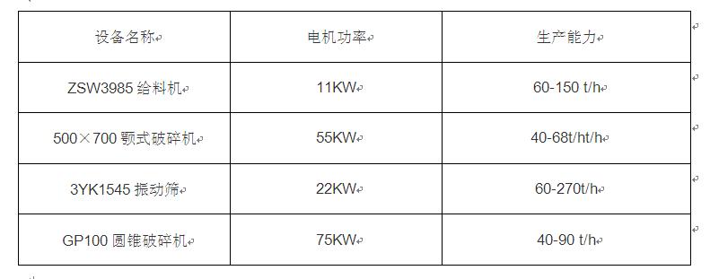 2.设备配置:ZSW3985给料机1台、500×700颚式破碎机1台、3YK1545振动筛1台、GP100圆锥破碎机1台套、移动轮胎拖车1台。