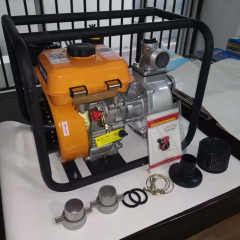水泵是 种离心泵。离心泵的工作原理就是在泵内充满水的情况下,发动机带动叶轮旋转,从而产生离心力,叶轮槽道中的水在离心力的作用下甩向外围流进泵壳,于是叶轮中心压力降低,这个压力低于进水管内压力,水就在这个压力差的作用下由吸水池流入叶轮。这样水泵就可以不断地吸水不断地供水了。型号 2/3/4寸