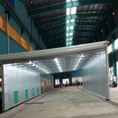 整体移动式喷漆间的设计目的,是为了满足较大型工件 打磨或喷漆的需要。 般情况下每套房体对应2~3个排风净位,哪个工位上的工件需要喷漆时,房体则行走移动到那个工位,其他工位可以继续打磨工作,待 房体内的工件喷漆完毕后,再控制移动房体行走到打磨完毕后的工件工位,如此设计可以实现大型工件的不间断连续喷漆工作。房体为钢结构构造,房体立柱下面设置有两台电动驱动行走机构,行走机构沿地面轨道行走。移动房体两端设置有电动卷帘大门,房体行走时,大门升起,待到达位置时,大门降落关闭。大门与行走机构由电气控制部分连锁控制,大门完全升起后,房体才可移动行走。
