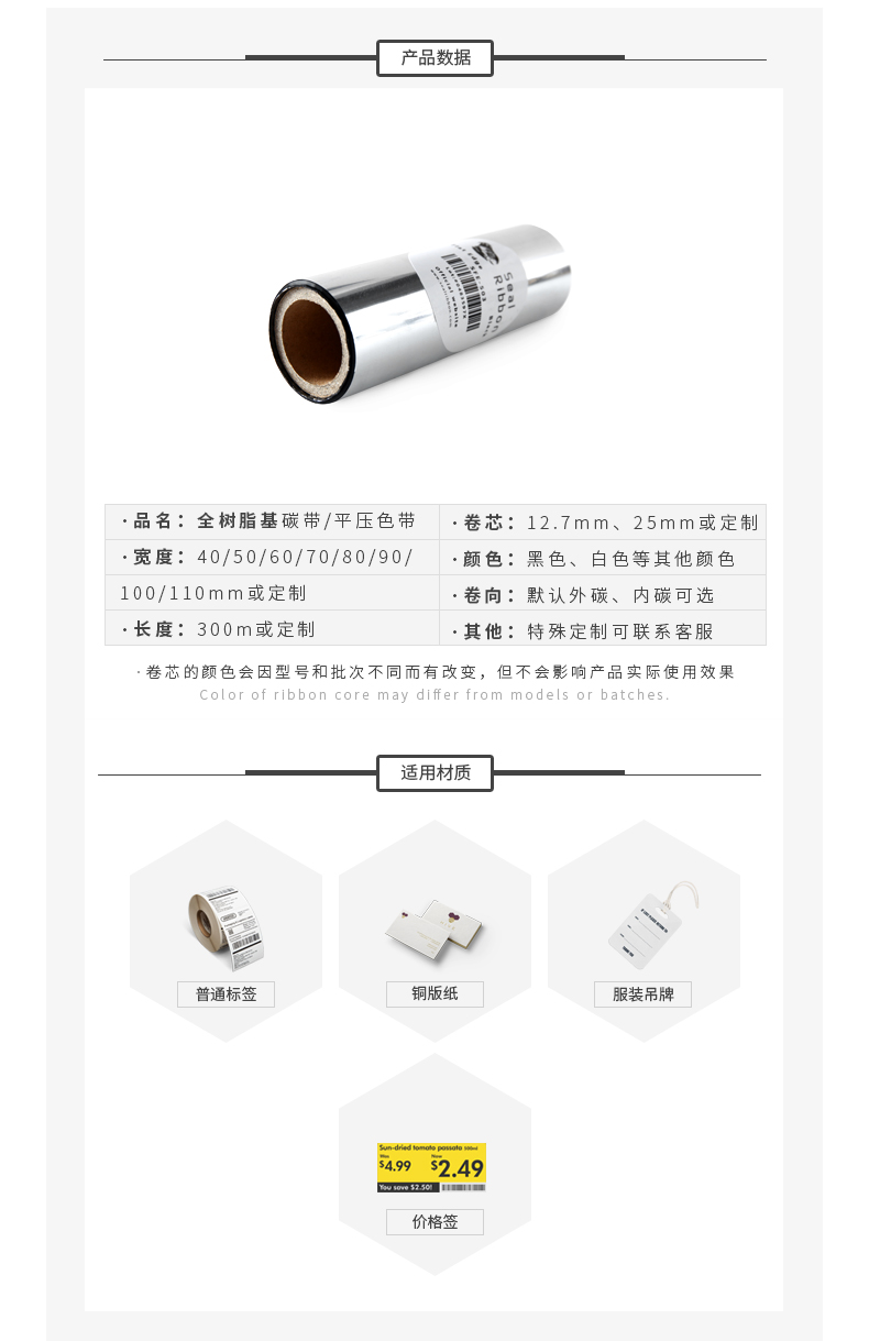 广州铭恒贸易有限公司经销的热转印打码机碳带、平压碳带、标签打印机碳带、条码打印机色带、打印头擦拭纸品种齐全、价格合理。本厂实力雄厚,重信用、守合同、保证产品质量,以多品种经营特色和薄利多销的原则,赢得了广大客户的信任。厂家直销条码打印机全树脂基碳带平压色带支持定制/零售/ 件代发/批发。