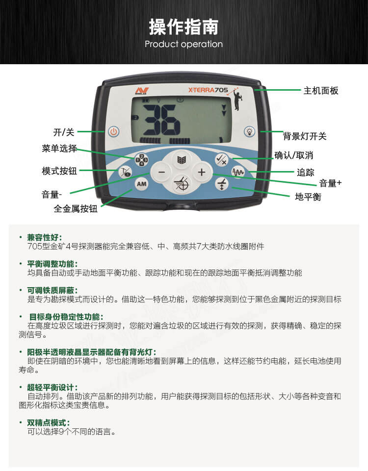 3、兼容低、中、高频线圈——所有7 X-TERRA辅助线圈可以X-TERRA 705使用。