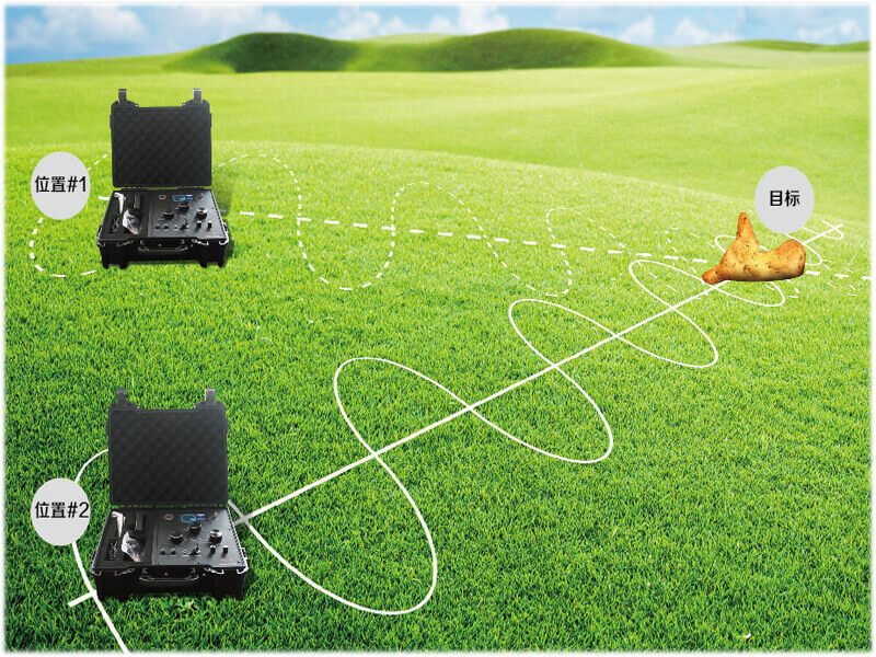 若存在目标物体,当我们走在目标物体和EPX10000地面探测器之间的传输线上时,两杆就会完全交叉。此传输线对于单个目标物来说通常是15厘米宽。我们可以通过仔细检查判断其是否为稳定信号。这样操作者需要返回、放松、再次移动到传输线上。若接收杆每次都会交叉,然后我们可以按照例2中的信号追踪图追踪目标信号。当操作员穿过埋藏的物体后,将无任何显示。目标物就位于 后 次杆交叉位置和无交叉显示的位置之间。金属探测器可用于对目标物体进行精确定位。参照我们的示例,继续练习以取得更好的效果。