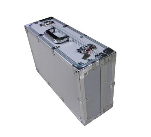 个带有锁的专用箱子,里面装有发射器及其它附件.该发射器是固定安装在箱子中的,发射器的面板上有六个LED指示灯,每个指示灯都代表着某项功能.在指示灯的下面有频率选择开关,由用户根据需要设置.在频率选项选择开关的下面有两个分别标有<水平><垂直>的旋纽.下面有电源开关,充电插孔(仪器采用优化冲电电路)及超载保护装置.