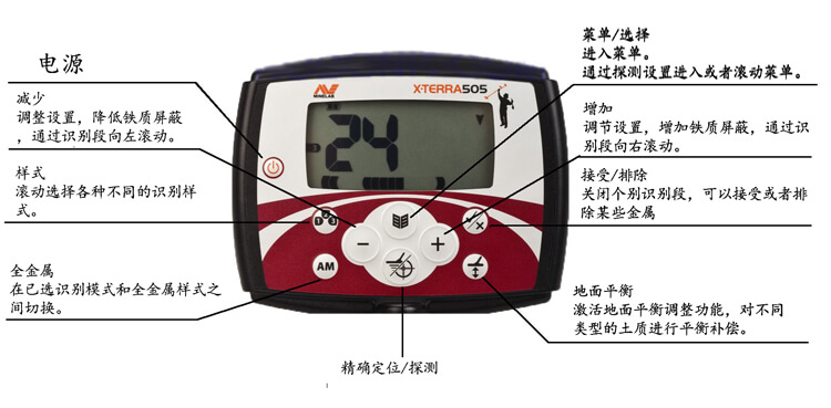 澳大利亚Minelab X-Terra505双盘版地下金属探测器 9寸同轴探盘+10.5寸DD探盘,高灵敏,定位准,抗矿化;自带3种警示音,有效区分有价值目标与垃圾;工作频率高,灵敏度高,信号稳定,可探测 小物件;三种探测模式,不同金属不同声音,加强弱音,实现 键探测;深度指示器让使用者分辨目标深度;探盘全防水,可选配替换。