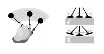 很客户在我们这里买到探宝器后就急着去探宝,但他们忽略了正确操作的重要性,以至于有很多客户明明工作人员在演示时可以探到宝物,但到自己操作时就探不到,正确的操作也是很重要的 个环节。如右图,在摆动探盘时,应该左右平行慢速移动,而不是随意移动探盘探测,正确的操作方法能让你提高工作效率和探测的准确性。