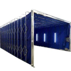 1、轨道:采用轻型地轨作为伸缩移动轨道。轨道的起始端和终止端特定位置,移动框架室体:由移动龙门架结构、伸缩房体支架、伸缩控制连杆、房体密封布等组成。