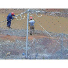 被动式防护网+++样品免费+++被动防护网由钢丝绳网或环形网(需拦截小块落石时附加 层铁丝格栅),固定系统(锚杆、拦锚绳、基座和支撑绳)、减压环和钢柱四个主要部分构成。钢柱和钢丝绳网连接组合构成 个整体,对所防护的区域形成面防护,从而阻止崩塌岩石土体的下坠,起到边坡防护作用。?被动防护网的柔性和拦截强度足以吸收和分散传递500KJ以内的落石冲击动能,消能环的设计和采用使系统的抗冲击能力得到进 步提高SNS被动防护网与刚性拦截和砌浆挡墙相比较,改变了原有施工工艺,使工期和资金得到减少。材质:钢丝绳网、支撑绳和减压环构造:由钢丝绳网或环形网(需拦截小块落石时附加 层铁丝格栅)、固定系统(锚杆、拦锚绳、基座和支撑绳)、减压环和钢柱四个主要部分构成。