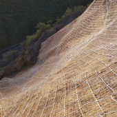 主动网 主要特征构成分为钢丝绳网、钢丝格栅和高强度钢丝格栅三类,前两者通过钢丝绳锚杆和支撑绳固定方式,后者通过钢4.1加预应力)和钢丝绳锚杆(有边沿支撑绳时采用)、锚垫板以及必要时加边沿支撑绳等固定方式,将作为系统特征构成的柔性网覆盖在有潜在地质灾害的坡面上,从而实现起防护目的。主动网按起防护功能、防护能力、特征构成和机构形式的不同分为两类:起加固作用的主动网、起围护作用的主动网。