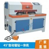 切角钻孔 体机,气动切角钻孔连动,切钻高速稳定,主要用于木质相框,门框,橱柜门桌椅框架45°角斜钻孔,用木钉对成90°加工成型。快速,安全,高效